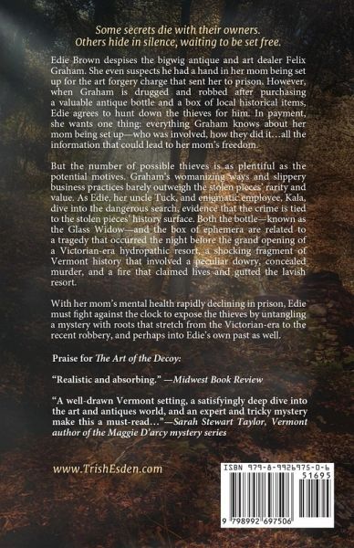 Some secrets die with their owners. Others hide in silence, waiting to be set free. Edie Brown despises the bigwig antique and art dealer Felix Graham. She even suspects he had a hand in her mom being set up for the art forgery charge that sent her to prison. However, when Graham is drugged and robbed after purchasing a valuable antique bottle and a box of local historical items, Edie agrees to hunt down the thieves for him. In payment, she wants one thing: everything Graham knows about her mom being set up-who was involved, how they did it...all the information that could lead to her mom's freedom. But the number of possible thieves is as plentiful as the potential motives. Graham's womanizing ways and slippery business practices barely outweigh the stolen pieces' rarity and value. As Edie, her uncle Tuck, and enigmatic employee, Kala, dive into the dangerous search, evidence that the crime is tied to the stolen pieces' history surface. Both the bottle-known as the Glass Widow-and the box of ephemera are related to a tragedy that occurred the night before the grand opening of a Victorian-era hydropathic resort, a shocking fragment of Vermont history that involved a peculiar dowry, concealed murder, and a fire that claimed lives and gutted the lavish resort. With her mom's mental health rapidly declining in prison, Edie must fight against the clock to expose the thieves by untangling a mystery with roots that stretch from the Victorian-era to the recent robbery, and perhaps into Edie's own past as well.