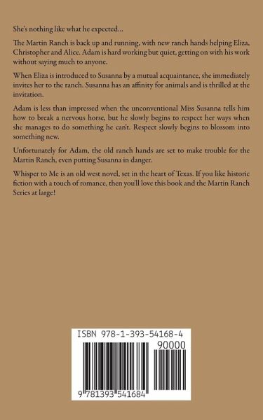 She's nothing like what he expected… The Martin Ranch is back up and running, with new ranch hands helping Eliza, Christopher and Alice. Adam is hard working but quiet, getting on with his work without saying much to anyone. When Eliza is introduced to Susanna by a mutual acquaintance, she immediately invites her to the ranch. Susanna has an affinity for animals and is thrilled at the invitation. Adam is less than impressed when the unconventional Miss Susanna tells him how to break a nervous horse, but he slowly begins to respect her ways when she manages to do something he can't. Respect slowly begins to blossom into something new. Unfortunately for Adam, the old ranch hands are set to make trouble for the Martin Ranch, even putting Susanna in danger. Whisper to Me is an old west novel, set in the heart of Texas. If you like historic fiction with a touch of romance, then you'll love this book and the Martin Ranch Series at large!