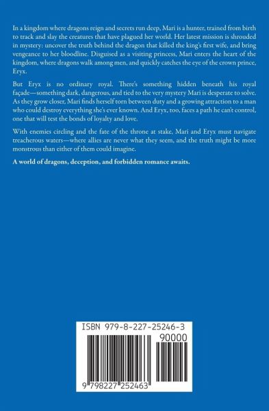 In a kingdom where dragons reign and secrets run deep, Mari is a hunter, trained from birth to track and slay the creatures that have plagued her world. Her latest mission is shrouded in mystery: uncover the truth behind the dragon that killed the king's first wife, and bring vengeance to her bloodline. Disguised as a visiting princess, Mari enters the heart of the kingdom, where dragons walk among men, and quickly catches the eye of the crown prince, Eryx. But Eryx is no ordinary royal. There's something hidden beneath his royal façade-something dark, dangerous, and tied to the very mystery Mari is desperate to solve. As they grow closer, Mari finds herself torn between duty and a growing attraction to a man who could destroy everything she's ever known. And Eryx, too, faces a path he can't control, one that will test the bonds of loyalty and love. With enemies circling and the fate of the throne at stake, Mari and Eryx must navigate treacherous waters-where allies are never what they seem, and the truth might be more monstrous than either of them could imagine. A world of dragons, deception, and forbidden romance awaits.