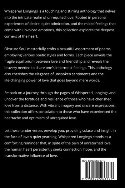 Whispered Longings is a touching and stirring anthology that delves into the intricate realm of unrequited love. Rooted in personal experiences of desire, quiet admiration, and the mixed feelings that come with unvoiced emotions, this collection explores the deepest corners of the heart. Obscure Soul masterfully crafts a beautiful assortment of poems, employing various poetic styles and forms. Each piece unveils the fragile equilibrium between love and friendship and reveals the bravery needed to share one's innermost feelings. This anthology also cherishes the elegance of unspoken sentiments and the life-changing power of love that goes beyond mere words. Embark on a journey through the pages of Whispered Longings and uncover the fortitude and resilience of those who have cherished love from a distance. With vibrant imagery and sincere expressions, this collection offers consolation to those who have experienced the heartache and optimism of unrequited love. Let these tender verses envelop you, providing solace and insight in the face of love's quiet yearning. Whispered Longings stands as a comforting reminder that, in spite of the pain of unreturned love, the human heart persistently seeks connection, hope, and the transformative influence of love.