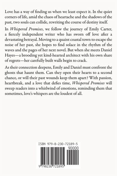 Love has a way of finding us when we least expect it. In the quiet corners of life, amid the chaos of heartache and the shadows of the past, two souls can collide, rewriting the course of destiny itself. In Whispered Promises, we follow the journey of Emily Carter, a fiercely independent writer who has sworn off love after a devastating betrayal. Moving to a quaint coastal town to escape the noise of her past, she hopes to find solace in the rhythm of the waves and the pages of her next novel. But when she meets Daniel Hayes-a brooding yet kind-hearted architect with his own share of regrets-her carefully built walls begin to crack. As their connection deepens, Emily and Daniel must confront the ghosts that haunt them. Can they open their hearts to a second chance, or will their past wounds keep them apart? With passion, heartbreak, and a love that defies time, Whispered Promises will sweep readers into a whirlwind of emotions, reminding them that sometimes, love's whispers are the loudest of all.