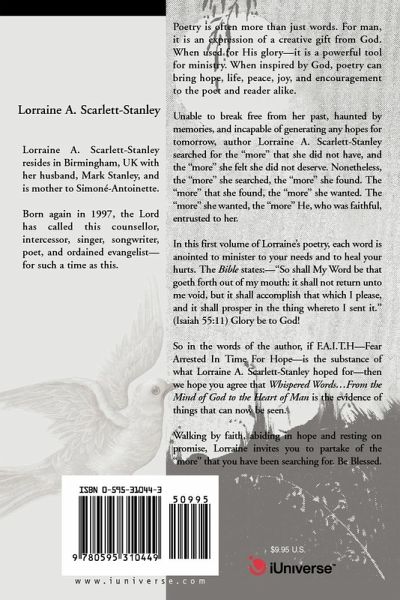 Poetry is often more than just words. For man, it is an expression of a creative gift from God. When used for His glory--it is a powerful tool for ministry. When inspired by God, poetry can bring hope, life, peace, joy, and encouragement to the poet and reader alike. Unable to break free from her past, haunted by memories, and incapable of generating any hopes for tomorrow, author Lorraine A. Scarlett-Stanley searched for the "more" that she did not have, and the "more" she felt she did not deserve. Nonetheless, the "more" she searched, the "more" she found. The "more" that she found, the "more" she wanted. The "more" she wanted, the "more" He, who was faithful, entrusted to her. In this first volume of Lorraine's poetry, each word is anointed to minister to your needs and to heal your hurts. The Bible states:--"So shall My Word be that goeth forth out of my mouth: it shall not return unto me void, but it shall accomplish that which I please, and it shall prosper in the thing whereto I sent it." (Isaiah 55:11) Glory be to God! So in the words of the author, if F.A.I.T.H--Fear Arrested In Time For Hope--is the substance of what Lorraine A. Scarlett-Stanley hoped for--then we hope you agree that Whispered Words...From the Mind of God to the Heart of Man is the evidence of things that can now be seen. Walking by faith, abiding in hope and resting on promise, Lorraine invites you to partake of the "more" that you have been searching for. Be Blessed.