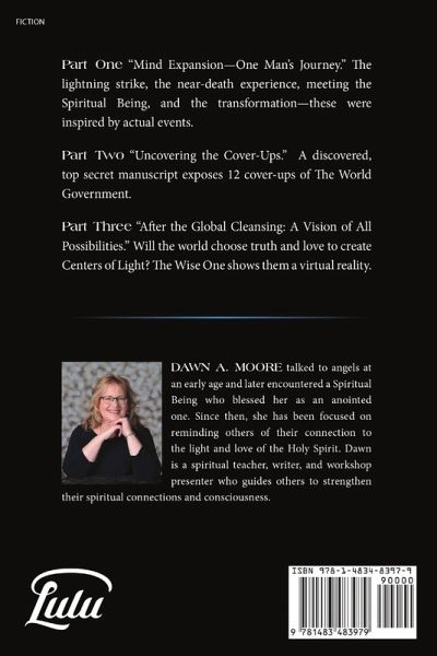 Part One "Mind Expansion-One Man's Journey." The lightning strike, the near-death experience, meeting the Spiritual Being, and the transformation-these were inspired by actual events. Part Two "Uncovering the Cover-Ups." A discovered, top secret manuscript exposes 12 cover-ups of The World Government. Part Three "After the Global Cleansing: A Vision of All Possibilities." Will the world choose truth and love to create Centers of Light? The Wise One shows them a virtual reality.