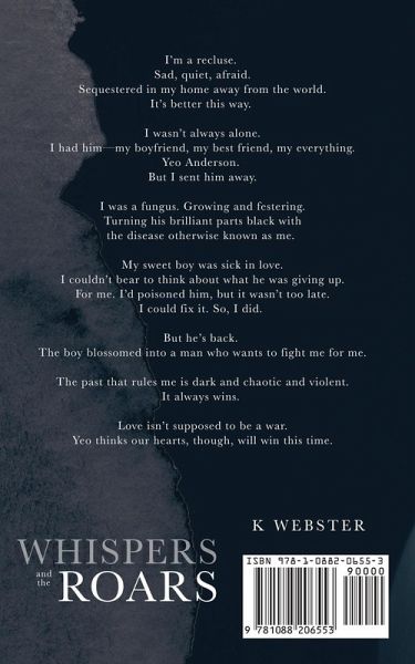 ***THIS STANDALONE IS BEST ENJOYED WHEN YOU DON'T READ ANY REVIEWS OR SPOILERS BEFORE READING. GOING IN BLIND IS BEST. TRUST ME.*** From USA Today bestselling author K Webster comes a gripping and emotional psychological romance standalone! I'm a recluse. Sad, quiet, afraid. Sequestered in my home away from the world. It's better this way. I wasn't always alone. I had him-my boyfriend, my best friend, my everything. Yeo Anderson. But I sent him away. I was a fungus. Growing and festering. Turning his brilliant parts black with the disease otherwise known as me. My sweet boy was sick in love. I couldn't bear to think about what he was giving up. For me. I'd poisoned him, but it wasn't too late. I could fix it. So, I did. But he's back. The boy blossomed into a man who wants to fight me for me. The past that rules me is dark and chaotic and violent. It always wins. Love isn't supposed to be a war. Yeo thinks our hearts, though, will win this time. Warning: Whispers and the Roars is a dark romance. Strong sexual themes and violence, which could trigger emotional distress, are found in this story. The abuse written in this story is graphic and not glossed over, which could be upsetting to some. This story is NOT for everyone. Proceed with caution.