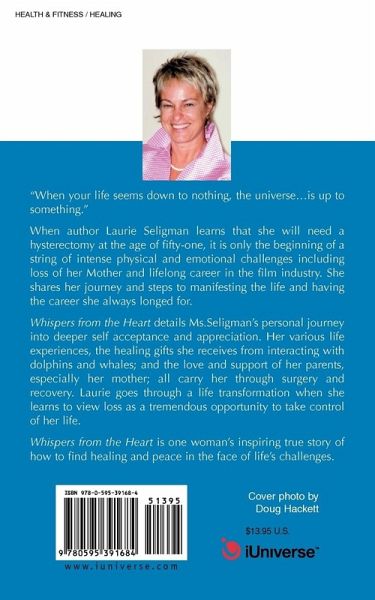 "When your life seems down to nothing, the universe.is up to something." When author Laurie Seligman learns that she will need a hysterectomy at the age of fifty-one, it is only the beginning of a string of intense physical and emotional challenges including loss of her Mother and lifelong career in the film industry. She shares her journey and steps to manifesting the life and having the career she always longed for. Whispers from the Heart details Ms.Seligman's personal journey into deeper self acceptance and appreciation. Her various life experiences, the healing gifts she receives from interacting with dolphins and whales; and the love and support of her parents, especially her mother; all carry her through surgery and recovery. Laurie goes through a life transformation when she learns to view loss as a tremendous opportunity to take control of her life. Whispers from the Heart is one woman's inspiring true story of how to find healing and peace in the face of life's challenges.