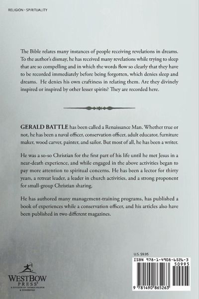 Gerald Battle has been called a Renaissance Man. Whether true or not, he has been a naval officer, conservation officer, adult educator, furniture maker, wood carver, painter, and sailor. But most of all, he has been a writer. He was a so-so Christian for the first part of his life until he met Jesus in a near-death experience, and while engaged in the above activities began to pay more attention to spiritual concerns. He has been a lector for thirty years, a retreat leader, a leader in church activities, and a strong proponent for small-group Christian sharing. He has authored many management-training programs, has published a book of experiences while a conservation officer, and his articles also have been published in two different magazines.