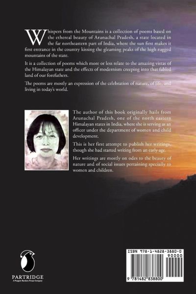 Whispers from the Mountains is a collection of poems based on the ethereal beauty of Arunachal Pradesh, a state located in the far northeastern part of India, where the sun first makes it first entrance in the country kissing the gleaming peaks of the high rugged mountains of the state. It is a collection of poems which more or less relate to the amazing vistas of the Himalayan state and the effects of modernism creeping into that fabled land of our forefathers. The poems are mostly an expression of the celebration of nature, of life, and living in today's world.