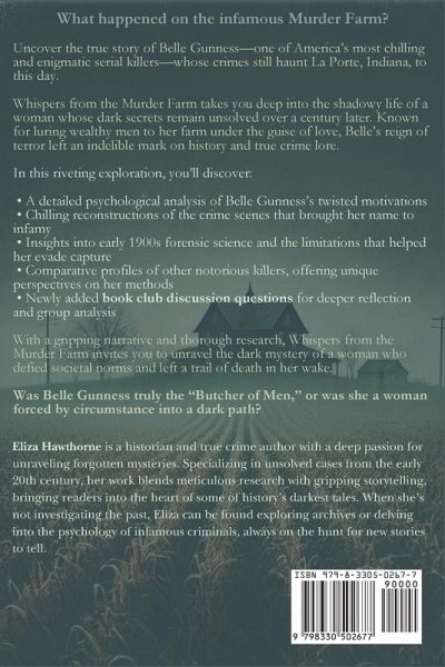 Unearth the Dark Secrets of Belle Gunness: One of America's Most Notorious Female Serial Killers Step into the chilling labyrinth of early 1900s America, where the quiet rural landscape of La Porte, Indiana, harbored one of the darkest tales in true crime history. Are you captivated by unsolved mysteries that defy explanation? Do you crave the challenge of untangling clues while delving deep into the mind of a femme fatale whose crimes sent shockwaves through an unsuspecting community? "Whispers from the Murder Farm: The Case of Belle Gunness" is more than a recounting of Belle Gunness's horrific deeds-it's a journey into the mind of a woman who eluded justice and whose fate remains a haunting mystery. Here's a glimpse of what awaits you: Bonus for True Crime Enthusiasts and Book Clubs: Not only does this book unravel one of history's most perplexing mysteries, but it also invites you to dive deeper with specially crafted book club discussion questions. Perfect for sparking in-depth conversations and debates about the motives, psychology, and enduring mystery surrounding Belle Gunness. Why this book stands apart: While some may argue that Belle Gunness's story has been covered before, this book brings new perspectives and meticulously researched details that avoid sensationalism. You'll find a balanced narrative that explores the full scope of Belle's life, her victims, and the societal conditions that allowed her to operate undetected for so long. Perfect for fans of: If you're ready to immerse yourself in one of America's most gripping and unsolved mysteries, grab your copy today. Click "Add to Cart" and let the chilling whispers of Belle Gunness's legacy guide you through a shadowy journey of horror, intrigue, and discovery.