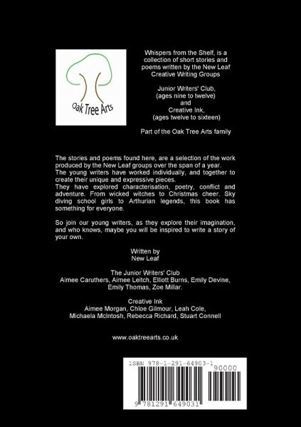 Written by the New Leaf creative writing groups. The Junior writers' club (ages 9-12) and Creative Ink (ages 12-16) Whispers from the Shelf, is a collection of short stories and poems. The young writers have worked individually, and in groups to create their unique and expressive pieces. They have explored characterisation, poetry, conflict and adventure. From wicked witches to Christmas cheer. Sky diving school girls to Arthurian legends, this book has something for everyone. So join our young writers as they explore the written word, and who knows, maybe you will be inspired to write a story of your own.
