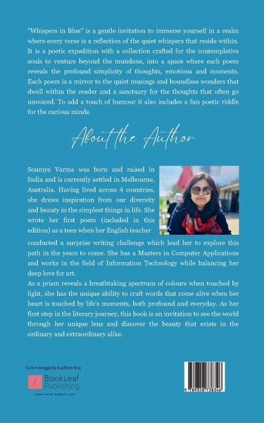Whispers in Blue is a gentle invitation to immerse yourself in a realm where every verse is a reflection of the quiet whispers that reside within, awaiting to be discovered including a surprise poetic riddle with a touch of humor. Embark upon a poetic expedition with a collection crafted for the contemplative souls to venture beyond the veil of the mundane, into a space where each poem reveals the profound simplicity of thoughts, emotions and moments. Each poem, a mirror to the quiet musings and boundless wonders that dwell within the reader. This collection is more than just a book; it's a companion for the introspective wanderer, a sanctuary for the thoughts that often go unvoiced.