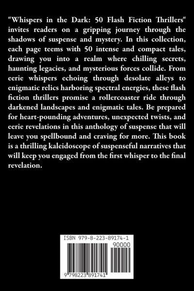 "Whispers in the Dark: 50 Flash Fiction Thrillers" invites readers on a gripping journey through the shadows of suspense and mystery. In this collection, each page teems with 50 intense and compact tales, drawing you into a realm where chilling secrets, haunting legacies, and mysterious forces collide. From eerie whispers echoing through desolate alleys to enigmatic relics harboring spectral energies, these flash fiction thrillers promise a rollercoaster ride through darkened landscapes and enigmatic tales. Be prepared for heart-pounding adventures, unexpected twists, and eerie revelations in this anthology of suspense that will leave you spellbound and craving for more. This book is a thrilling kaleidoscope of suspenseful narratives that will keep you engaged from the first whisper to the final revelation.