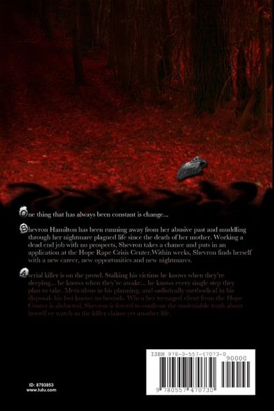 One thing that has always been constant is change.... Shevron Hamilton has been running away from her abusive past and muddling through her nightmare plagued life since the death of her mother. In a dead end job with no prospects, Shevron takes a chance and puts in an application at the Hope Rape Crisis Center. Within weeks Shevron finds herself with a new job, new opportunities and new nightmares. A killer is on the loose. One that stalks his victims. He knows when they're sleeping. He's knows when they're awake. He knows every single step that they will take. Meticulous in his planning, and methodical in his disposal his lust and rage knows no bounds. When a young teenager is abducted. Shevron is forced to confront the truth about herself or watch as the killer claims another life.