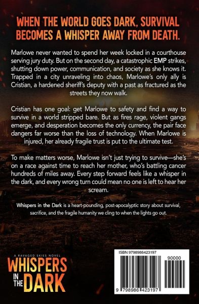 Whispers in the Dark A Ravaged Skies Novel When the world goes dark, survival becomes a whisper away from death. Marlowe never wanted to spend her week locked in a courthouse serving jury duty. But on the second day, a catastrophic EMP strikes, shutting down power, communication, and society as she knows it. Trapped in a city unraveling into chaos, Marlowe's only ally is Cristian, a hardened sheriff's deputy with a past as fractured as the streets they now walk. Cristian has one goal: get Marlowe to safety and find a way to survive in a world stripped bare. But as fires rage, violent gangs emerge, and desperation becomes the only currency, the pair face dangers far worse than the loss of technology. When Marlowe is injured, her already fragile trust is put to the ultimate test. To make matters worse, Marlowe isn't just trying to survive-she's on a race against time to reach her mother, who's battling cancer hundreds of miles away. Every step forward feels like a whisper in the dark, and every wrong turn could mean no one is left to hear her scream. Whispers in the Dark is a heart-pounding, post-apocalyptic story about survival, sacrifice, and the fragile humanity we cling to when the lights go out. Whispers in the Dark is a Ravaged Skies shared world novel.