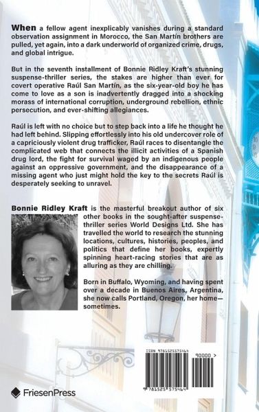 When a fellow agent inexplicably vanishes during a standard observation assignment in Morocco, the San Martín brothers are pulled, yet again, into a dark underworld of organized crime, drugs, and global intrigue. But in the seventh installment of Bonnie Ridley Kraft's stunning suspense-thriller series, the stakes are higher than ever for covert operative Raúl San Martín, as the six-year-old boy he has come to love as a son is inadvertently dragged into a shocking morass of international corruption, underground rebellion, ethnic persecution, and ever-shifting allegiances. Raúl is left with no choice but to step back into a life he thought he had left behind. Slipping effortlessly into his old undercover role of a capriciously violent drug trafficker, Raúl races to disentangle the complicated web that connects the illicit activities of a Spanish drug lord, the fight for survival waged by an indigenous people against an oppressive government, and the disappearance of a missing agent who just might hold the key to the secrets Raúl is desperately seeking to unravel.