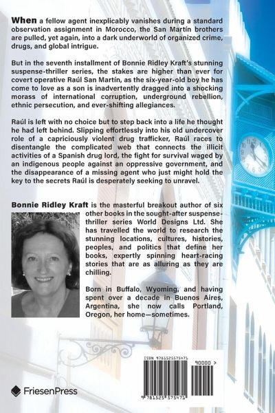 When a fellow agent inexplicably vanishes during a standard observation assignment in Morocco, the San Martín brothers are pulled, yet again, into a dark underworld of organized crime, drugs, and global intrigue. But in the seventh installment of Bonnie Ridley Kraft's stunning suspense-thriller series, the stakes are higher than ever for covert operative Raúl San Martín, as the six-year-old boy he has come to love as a son is inadvertently dragged into a shocking morass of international corruption, underground rebellion, ethnic persecution, and ever-shifting allegiances. Raúl is left with no choice but to step back into a life he thought he had left behind. Slipping effortlessly into his old undercover role of a capriciously violent drug trafficker, Raúl races to disentangle the complicated web that connects the illicit activities of a Spanish drug lord, the fight for survival waged by an indigenous people against an oppressive government, and the disappearance of a missing agent who just might hold the key to the secrets Raúl is desperately seeking to unravel.