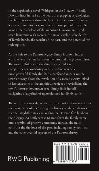 In the captivating novel "Whispers in the Shadows," Emily Dawson finds herself at the heart of a gripping psychological thriller that weaves through the intricate tapestry of family legacy, community ties, and the haunting pull of history. Set against the backdrop of the imposing Dawson estate and a town brimming with secrets, this novel explores the depths of family bonds, the weight of the past, and the potential for redemption. As the heir to the Dawson legacy, Emily is drawn into a world where the line between the past and the present blurs. The story unfolds with the discovery of hidden compartments, long-lost journals, and secrets of a once-powerful family that had a profound impact on the town's history. From the revelation of a secret society linked to her ancestors to the ambitious project of revitalizing the town's historic downtown area, Emily finds herself navigating a labyrinth of mysteries and family dynamics. The narrative takes the reader on an emotional journey, from the excitement of uncovering lost history to the challenges of reconciling different views within the Dawson family about their legacy. As Emily works to transform the family name into a symbol of positive community impact, she must confront the shadows of the past, including family conflicts and the controversial aspects of the Dawson history. "Whispers in the Shadows" delves deep into the psychology of family and community, exploring how history can shape the present and future. It's a story of transformation and hope, where the restoration of buildings mirrors the rebuilding of relationships and the reshaping of a family's influence. The novel beautifully captures the essence of change, from the creation of a cultural center that celebrates art, history, and education to the strengthening of family ties and community bonds. In this enthralling tale, Emily emerges as a beacon of resilience and vision, leading her family and the community towards a new era. The novel masterfully intertwines suspense with a deep exploration of societal and familial themes, making "Whispers in the Shadows" an unforgettable journey into the heart of a small town and the soul of a family legacy. This book is perfect for readers who love psychological thrillers with a rich backdrop of historical intrigue, family drama, and a quest for redemption.