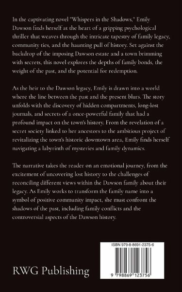 In the captivating novel "Whispers in the Shadows," Emily Dawson finds herself at the heart of a gripping psychological thriller that weaves through the intricate tapestry of family legacy, community ties, and the haunting pull of history. Set against the backdrop of the imposing Dawson estate and a town brimming with secrets, this novel explores the depths of family bonds, the weight of the past, and the potential for redemption. As the heir to the Dawson legacy, Emily is drawn into a world where the line between the past and the present blurs. The story unfolds with the discovery of hidden compartments, long-lost journals, and secrets of a once-powerful family that had a profound impact on the town's history. From the revelation of a secret society linked to her ancestors to the ambitious project of revitalizing the town's historic downtown area, Emily finds herself navigating a labyrinth of mysteries and family dynamics. The narrative takes the reader on an emotional journey, from the excitement of uncovering lost history to the challenges of reconciling different views within the Dawson family about their legacy. As Emily works to transform the family name into a symbol of positive community impact, she must confront the shadows of the past, including family conflicts and the controversial aspects of the Dawson history. "Whispers in the Shadows" delves deep into the psychology of family and community, exploring how history can shape the present and future. It's a story of transformation and hope, where the restoration of buildings mirrors the rebuilding of relationships and the reshaping of a family's influence. The novel beautifully captures the essence of change, from the creation of a cultural center that celebrates art, history, and education to the strengthening of family ties and community bonds. In this enthralling tale, Emily emerges as a beacon of resilience and vision, leading her family and the community towards a new era. The novel masterfully intertwines suspense with a deep exploration of societal and familial themes, making "Whispers in the Shadows" an unforgettable journey into the heart of a small town and the soul of a family legacy. This book is perfect for readers who love psychological thrillers with a rich backdrop of historical intrigue, family drama, and a quest for redemption.