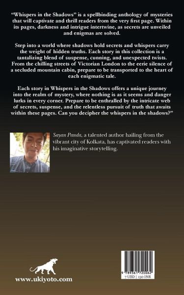 "Whispers in the Shadows" is a spellbinding anthology of mysteries that will captivate and thrill readers from the very first page. Within its pages, darkness and intrigue intertwine, as secrets are unveiled and enigmas are solved. Step into a world where shadows hold secrets and whispers carry the weight of hidden truths. Each story in this collection is a tantalizing blend of suspense, cunning, and unexpected twists. From the chilling streets of Victorian London to the eerie silence of a secluded mountain cabin, prepare to be transported to the heart of each enigmatic tale. Each story in Whispers in the Shadows offers a unique journey into the realm of mystery, where nothing is as it seems and danger lurks in every corner. Prepare to be enthralled by the intricate web of secrets, suspense, and the relentless pursuit of truth that awaits within these pages. Can you decipher the whispers in the shadows?"