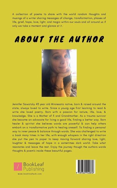 A collection of poems to share with the world random thoughts and musings of a writer sharing messages of change, transformation, phases of life, grief, hope, love, light, and magic within our souls and all around us if only we take a moment and glance at it.
