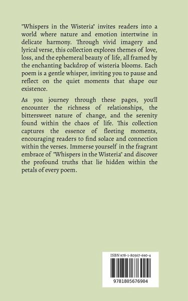 "Whispers in the Wisteria" invites readers into a world where nature and emotion intertwine in delicate harmony. Through vivid imagery and lyrical verse, this collection explores themes of love, loss, and the ephemeral beauty of life, all framed by the enchanting backdrop of wisteria blooms. Each poem is a gentle whisper, inviting you to pause and reflect on the quiet moments that shape our existence. As you journey through these pages, you'll encounter the richness of relationships, the bittersweet nature of change, and the serenity found within the chaos of life. This collection captures the essence of fleeting moments, encouraging readers to find solace and connection within the verses. Immerse yourself in the fragrant embrace of "Whispers in the Wisteria" and discover the profound truths that lie hidden within the petals of every poem.