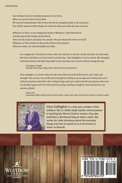 God whispers in the everyday moments of our lives. Often, we are too busy to hear Him. We must be intentionally still to hear the divine symphony that is all around us. You will be amazed at the things you will hear when you take the time to listen. Whispers in Verse is the companion book to Whispers of His Movement. God has placed the psalms in His Word. They are the prayers and pleas of a people who are desperate to be near God. Whispers in Verse listens to the poetry that is all around us. When we listen, we will inevitably hear Him.