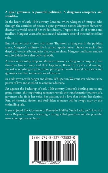 A quiet governess. A powerful politician. A dangerous conspiracy and scandal... In the heart of early 19th-century London, where whispers of intrigue echo through the corridors of power, a quiet governess named Margaret Hayworth discovers a world beyond her wildest dreams. Trapped in a life of routine and intellect, Margaret yearns for passion and adventure beyond the confines of her role. But when her path crosses with James Thornton, a rising star in the political arena, Margaret's ordinary life is turned upside down. Drawn to each other despite the societal boundaries that separate them, Margaret and James embark on a forbidden love that defies all odds. As their relationship deepens, Margaret uncovers a dangerous conspiracy that threatens James's career and their happiness. Bound by loyalty and courage, she risks everything to protect him, proving her worth beyond her station and igniting a love that transcends social barriers. In a tale woven with danger and desire, Whispers in Westminster celebrates the power of love and intellect to conquer adversity. Set against the backdrop of early 19th-century London's bustling streets and grand estates, this captivating romance reveals the transformative journey of a governess who finds her voice, her passion, and a love that defines her destiny. Fans of historical fiction and forbidden romance will be swept away by this enthralling tale. If you enjoyed The Governess of Penwythe Hall by Sarah Ladd, you'll love this sweet Regency romance featuring a strong-willed governess and the powerful man who captures her heart.