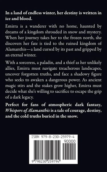 In a land of endless winter, her destiny is written in ice and blood. Emirra is a wanderer with no home, haunted by dreams of a kingdom shrouded in snow and mystery. When her journey takes her to the frozen north, she discovers her fate is tied to the ruined kingdom of Alamanthis-a land cursed by its past and gripped by an eternal winter. With a sorceress, a paladin, and a thief as her unlikely allies, Emirra must navigate treacherous landscapes, uncover forgotten truths, and face a shadowy figure who seeks to awaken a dangerous power. As ancient magic stirs and the stakes grow higher, Emirra must decide what she's willing to sacrifice to escape the grip of a dark legacy. Perfect for fans of atmospheric dark fantasy, Whispers of Alamanthis is a tale of courage, destiny, and the cold truths buried in the snow.