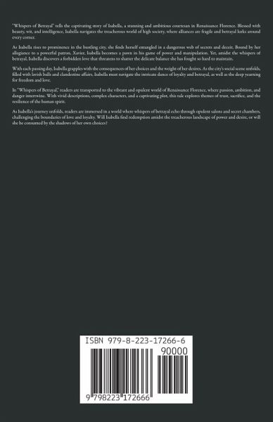 "Whispers of Betrayal" tells the captivating story of Isabella, a stunning and ambitious courtesan in Renaissance Florence. Blessed with beauty, wit, and intelligence, Isabella navigates the treacherous world of high society, where alliances are fragile and betrayal lurks around every corner. As Isabella rises to prominence in the bustling city, she finds herself entangled in a dangerous web of secrets and deceit. Bound by her allegiance to a powerful patron, Xavier, Isabella becomes a pawn in his game of power and manipulation. Yet, amidst the whispers of betrayal, Isabella discovers a forbidden love that threatens to shatter the delicate balance she has fought so hard to maintain. With each passing day, Isabella grapples with the consequences of her choices and the weight of her desires. As the city's social scene unfolds, filled with lavish balls and clandestine affairs, Isabella must navigate the intricate dance of loyalty and betrayal, as well as the deep yearning for freedom and love. In "Whispers of Betrayal," readers are transported to the vibrant and opulent world of Renaissance Florence, where passion, ambition, and danger intertwine. With vivid descriptions, complex characters, and a captivating plot, this tale explores themes of trust, sacrifice, and the resilience of the human spirit. As Isabella's journey unfolds, readers are immersed in a world where whispers of betrayal echo through opulent salons and secret chambers, challenging the boundaries of love and loyalty. Will Isabella find redemption amidst the treacherous landscape of power and desire, or will she be consumed by the shadows of her own choices?