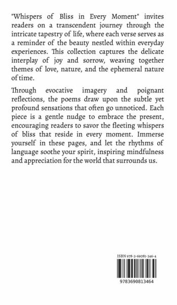 "Whispers of Bliss in Every Moment" invites readers on a transcendent journey through the intricate tapestry of life, where each verse serves as a reminder of the beauty nestled within everyday experiences. This collection captures the delicate interplay of joy and sorrow, weaving together themes of love, nature, and the ephemeral nature of time. Through evocative imagery and poignant reflections, the poems draw upon the subtle yet profound sensations that often go unnoticed. Each piece is a gentle nudge to embrace the present, encouraging readers to savor the fleeting whispers of bliss that reside in every moment. Immerse yourself in these pages, and let the rhythms of language soothe your spirit, inspiring mindfulness and appreciation for the world that surrounds us.