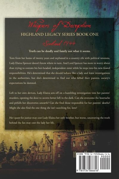 Scotland 1744 Truth can be deadly and family not what it seems. Torn from her home of twenty years and orphaned in a country rife with political tensions, Lady Elaina Spencer doesn't know where to turn. And Lord Spencer has more to worry about than trying to contain his hot-headed, independent sister while he steps into his new-found responsibilities. He's determined that she should behave like a lady and leave investigations to the authorities, but she's determined to find out who killed their parents, society's expectations be damned. Left to her own devices, Lady Elaina sets off on a bumbling investigation into her parents' murders, opening the door to secrets better left in the dark. Can she overcome the heartache and pitfalls her discoveries unearth? Can she find those responsible for her parents' deaths? Might she also find the one thing she isn't searching for, love? Her quest for justice may cost Lady Elaina her only brother, but worse, uncovering the truth behind the lies may cost the lady her life.
