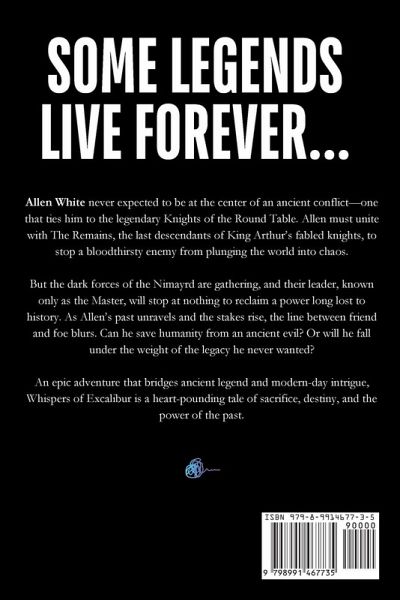 Allen White is just your average guy finishing senior year at college in New York City; at least that's what he thinks. On his 21st birthday, everything begins to change, and he's catapulted into a world of intrigue and terror, surrounded by a group of strangers who are helping him fight for his life-and theirs. What he doesn't know is that his new friends have come from near and far to join Allen for one common purpose: to save the world from destruction. Follow Allen and his friends as they battle the mysterious and dangerous Master, a bloodthirsty and powerful leader of The Nimayrd. Will Allen find Excalibur and uncover the truth? Will his newfound friends find a way to help him? This modern Arthurian tale is lighthearted, dark, adventurous, and historical. The echoes of the past become the Whispers of Excalibur.