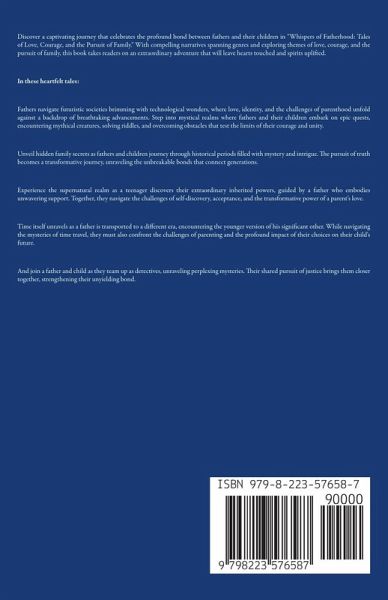 Discover a captivating journey that celebrates the profound bond between fathers and their children in "Whispers of Fatherhood: Tales of Love, Courage, and the Pursuit of Family." With compelling narratives spanning genres and exploring themes of love, courage, and the pursuit of family, this book takes readers on an extraordinary adventure that will leave hearts touched and spirits uplifted. In these heartfelt tales: Fathers navigate futuristic societies brimming with technological wonders, where love, identity, and the challenges of parenthood unfold against a backdrop of breathtaking advancements. Step into mystical realms where fathers and their children embark on epic quests, encountering mythical creatures, solving riddles, and overcoming obstacles that test the limits of their courage and unity. Unveil hidden family secrets as fathers and children journey through historical periods filled with mystery and intrigue. The pursuit of truth becomes a transformative journey, unraveling the unbreakable bonds that connect generations. Experience the supernatural realm as a teenager discovers their extraordinary inherited powers, guided by a father who embodies unwavering support. Together, they navigate the challenges of self-discovery, acceptance, and the transformative power of a parent's love. Time itself unravels as a father is transported to a different era, encountering the younger version of his significant other. While navigating the mysteries of time travel, they must also confront the challenges of parenting and the profound impact of their choices on their child's future. And join a father and child as they team up as detectives, unraveling perplexing mysteries. Their shared pursuit of justice brings them closer together, strengthening their unyielding bond. Immerse yourself in "Whispers of Fatherhood: Tales of Love, Courage, and the Pursuit of Family," where each page holds wonder, mystery, and magic. These captivating stories honor the complexities and beauty of fatherhood, showcasing the enduring power of love, the depths of courage, and the unbreakable pursuit of family. Perfect for readers seeking heartfelt narratives that inspire, this collection will resonate with anyone who cherishes the extraordinary relationship between fathers and their children. Take the journey and experience the whispers of fatherhood—a book that will touch your heart, ignite your imagination, and remind you of the profound impact fathers have on our lives. Note: This book contains a collection of diverse and engaging stories that celebrate fatherhood across different genres, including science fiction, fantasy, historical fiction, supernatural, romance, mystery, and adventure.