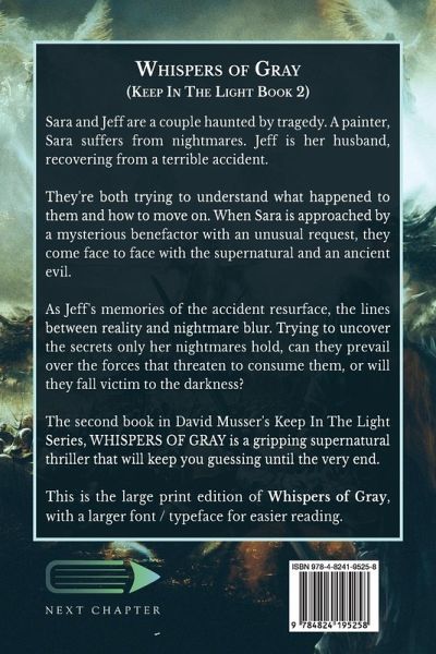 Sara and Jeff are a couple haunted by tragedy. A painter, Sara suffers from nightmares. Jeff is her husband, recovering from a terrible accident. They're both trying to understand what happened to them and how to move on. When Sara is approached by a mysterious benefactor with an unusual request, they come face to face with the supernatural and an ancient evil. As Jeff's memories of the accident resurface, the lines between reality and nightmare blur. Trying to uncover the secrets only her nightmares hold, can they prevail over the forces that threaten to consume them, or will they fall victim to the darkness? The second book in David Musser's Keep In The Light Series, WHISPERS OF GRAY is a gripping supernatural thriller that will keep you guessing until the very end. This is the large print edition of Whispers of Gray, with a larger font / typeface for easier reading.