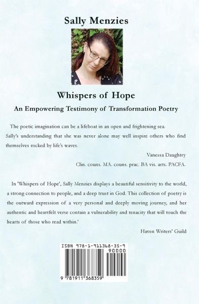 Not so much a collection of poetry as a deeply personal and revealing prayer diary expressed in poetic form. Sally's journey scales the heights and depths of personal realisation and expresses both joy and disappointment in accessible language with which many will understand and empathise . As part of the healing process, this work has been an essential part of Sally's re-emergence from some very dark moments. Throughout, her deep love of - and encounter with - God, is a touchstone. Sally's acceptance of the unconditional grace of Jesus continues to be a catalyst of profound transformation toward peace and wholeness. The poetic imagination can be a lifeboat in an open and frightening sea. Sally's understanding that she was never alone may well inspire others who find themselves rocked by life's waves.