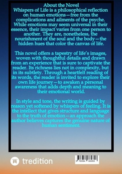 About the NovelWhispers of Life is a philosophical reflection on human emotions-free from the complications and ailments of the psyche. While emotions may seem universal in their essence, their impact varies from one person to another. They are, nonetheless, the nourishment of the soul and the body-the hidden hues that color the canvas of life.This novel offers a tapestry of life's images, woven with thoughtful details and drawn from an experience that is sure to captivate the reader. Its richness lies not in complexity, but in its subtlety. Through a heartfelt reading of its words, the reader is invited to explore their own life journey-to awaken a personal awareness that adds depth and meaning to their emotional world.In style and tone, the writing is guided by reason yet softened by whispers of feeling. It is the intellect that gives structure and language to the truth of emotion-an approach the author believes captures the genuine nature of human sentiment.