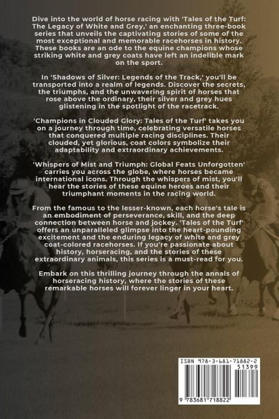 Prepare to embark on an extraordinary journey through the world of horse racing with 'Whispers of Mist and Triumph: Global Feats Unforgotten.' This captivating nonfiction book is an exploration of the most remarkable stories of iconic racehorses with white and grey coats, whose legacies continue to transcend time and borders. Within these pages, you'll discover the untold tales of legendary horses like Winx, whose unprecedented 33-race win streak and multiple Cox Plate victories left the racing world in awe. Dancing Brave, the elegant grey champion from the United Kingdom, whose triumph in the 1986 Prix de l'Arc de Triomphe is etched in racing history. Zenyatta, the beloved American mare, who remained unbeaten and claimed victory in the Breeders' Cup Classic. Nashwan, the grey wonder from the United Kingdom, who redefined greatness with his Epsom Derby and 2000 Guineas triumphs. You'll witness the global impact of these equine heroes and the enduring legacy they've left on the racing world. Unveil the mesmerizing world of jockeys, their vital roles, international collaborations, and the challenges they've faced across nations. And finally, celebrate the global racing community's profound connection to these unforgettable champions. 'Whispers of Mist and Triumph' is more than just a book; it's a tribute to the eternal allure of horse racing and the indomitable spirit of these magnificent horses. Don't miss your chance to experience their incredible stories and the thrill of the turf!