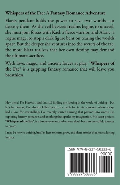 Whispers of the Fae: A Fantasy Romance Adventure Elara's pendant holds the power to save two worlds-or destroy them. As the veil between realms begins to unravel, she must join forces with Kael, a fierce warrior, and Alaric, a rogue mage, to stop a dark figure bent on tearing the worlds apart. But the deeper she ventures into the secrets of the fae, the more Elara realizes that her own destiny may demand the ultimate sacrifice. With love, magic, and ancient forces at play, "Whispers of the Fae" is a gripping fantasy romance that will leave you breathless.