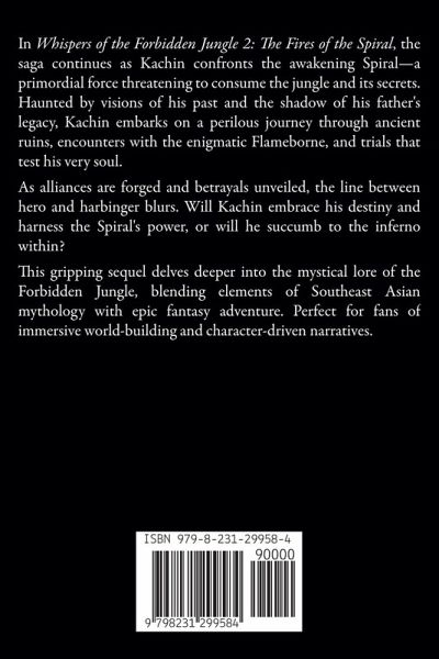 In Whispers of the Forbidden Jungle 2: The Fires of the Spiral, the saga continues as Kachin confronts the awakening Spiral-a primordial force threatening to consume the jungle and its secrets. Haunted by visions of his past and the shadow of his father's legacy, Kachin embarks on a perilous journey through ancient ruins, encounters with the enigmatic Flameborne, and trials that test his very soul.¿ As alliances are forged and betrayals unveiled, the line between hero and harbinger blurs. Will Kachin embrace his destiny and harness the Spiral's power, or will he succumb to the inferno within?¿ This gripping sequel delves deeper into the mystical lore of the Forbidden Jungle, blending elements of Southeast Asian mythology with epic fantasy adventure. Perfect for fans of immersive world-building and character-driven narratives.