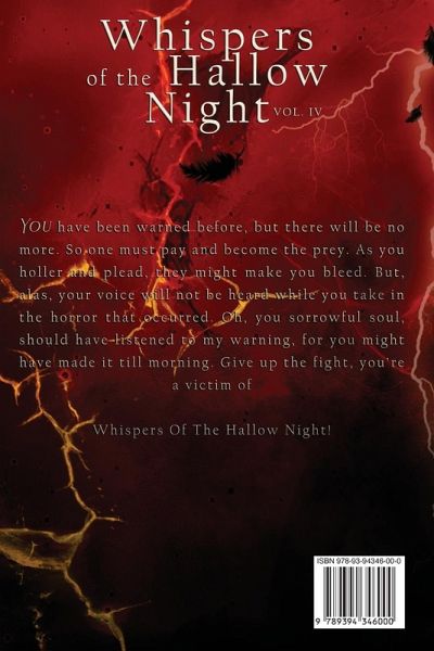 You have been warned before, but there will be no more. So one must pay and become the prey. As you holler and plead, they might make you bleed. But, alas, your voice will not be heard while you take in the horror that occurred. Oh, you sorrowful soul, should have listened to my warning, for you might have made it till morning. Give up the fight; you're a victim of Whispers Of The Hallow Night!