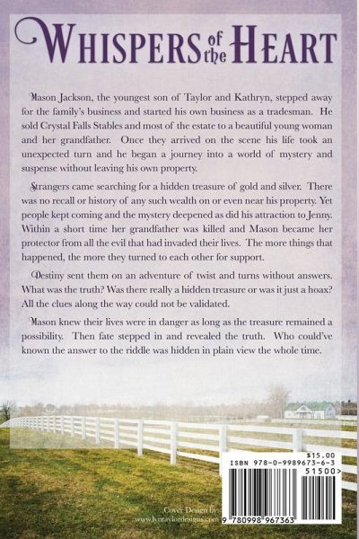 This is the fourth book in the Jackson Family Saga. Mason, the youngest son of Taylor and Kathryn sells the family business and begins a life as a tradesman. He sells the majority of the family estate to a beautiful young woman, Jenny Jones and her grandfather. When they move in Masons world takes an unexpected turn. Unusual things beng to happen. Strangers appear at his door asking to search for a hidden treasure on his property. Stories of a group of Union soldier traveling to Louisville, Kentucky during the Civil War with a load of silver and gold were warned of an attack by Reb's. Did they really hide the money on their property? He'd never heard of it. Was it true or was it a hoax? Jenny's grandfather is mysteriously murdered and now all alone she become frightened and dependent on Mason to provide protection. Each day a new problem arrises. Their lives become tangled in twist and turns as they search for a clue to the strange things that have overwhelmed theim. The deeper the problems the more they find comfort in a budding relationship There are clues along the way that leads to the truth, but who would have known that all the time the answer was in plain sight..