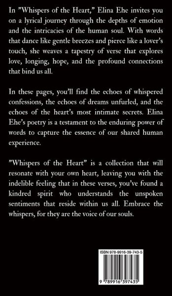 In "Whispers of the Heart," Elina Ehe invites you on a lyrical journey through the depths of emotion and the intricacies of the human soul. With words that dance like gentle breezes and pierce like a lover's touch, she weaves a tapestry of verse that explores love, longing, hope, and the profound connections that bind us all.In these pages, you'll find the echoes of whispered confessions, the echoes of dreams unfurled, and the echoes of the heart's most intimate secrets. Elina Ehe's poetry is a testament to the enduring power of words to capture the essence of our shared human experience."Whispers of the Heart" is a collection that will resonate with your own heart, leaving you with the indelible feeling that in these verses, you've found a kindred spirit who understands the unspoken sentiments that reside within us all. Embrace the whispers, for they are the voice of our souls.Copyright © 2024 Magical Fairy Tales Publishing