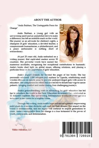 "Anila Bukhari, The Unstoppable Force for Change" Anila Bukhari, a young girl with an unwavering spirit and an unmatched drive to make a difference, has left an indelible mark on the world. Her journey as an advocate for children's rights, a champion of girls' education, a devoted teacher, a compassionate humanitarian, a philanthropist, and a peace ambassador is nothing short of extraordinary. At just 20 years old, Anila embarked on a writing journey that captivated readers across 50 countries. Her powerful words have earned her numerous accolades, recognizing her exceptional contributions to humanity. Anila's books shed light on global issues, offering solutions, and placing a particular focus on the importance of girls' education. Anila's impact extends far beyond the pages of her books. She has personally educated 1,000 refugees and orphans in Uganda, establishing small wooden libraries in remote areas to provide underprivileged girls with access to education. Her compassion for others has also led her to donate hair wigs to cancer patients, bringing comfort and smiles during their challenging journeys. Anila's groundbreaking work in advocating for girls' education has led her to introduce the world to the Girls' Education Awareness Day, celebrated in 11 different countries. Her unwavering determination to educate every girl is a testament to her vision for a brighter future. Through her writing, Anila instills hope and encouragement, empowering individuals to overcome obstacles and reach for their dreams. Her impact on the world is immeasurable, and her legacy will continue to inspire generations to come. Anila's unstoppable force for change is a true testament to the power of youth, compassion, and determination.