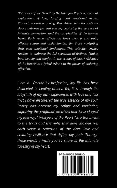 Whispers of the Heart, Journey Through Love's Depths and Embrace the Tapestry of Emotions. Dive into a world where love and longing intertwine, and emotional turbulence becomes a dance of passion and vulnerability. " Whispers of the Heart " is a captivating collection of poems that explores the multifaceted nature of love-its joys, sorrows, and the spaces in between. Each verse invites you to experience the delicate balance between intimacy and distance, hope and despair, connection and separation. With evocative imagery and heartfelt expression, these poems capture the essence of love's sanctuary and storm. From tender embraces under a moonlit sky to the pain of unspoken goodbyes, this collection offers a profound exploration of the heart's journey. Allow yourself to be moved by the whispers of what could have been, find solace in the echoes of love that linger, and discover poetry in the profound journey of the heart.