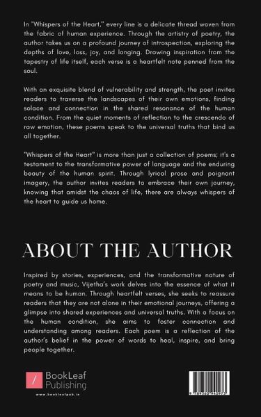 In ""Whispers of the Heart,"" every line is a delicate thread woven from the fabric of human experience. Through the artistry of poetry, the author takes us on a profound journey of introspection, exploring the depths of love, loss, joy, and longing. Drawing inspiration from the tapestry of life itself, each verse is a heartfelt note penned from the soul. With an exquisite blend of vulnerability and strength, the poet invites readers to traverse the landscapes of their own emotions, finding solace and connection in the shared resonance of the human condition. From the quiet moments of reflection to the crescendo of raw emotion, these poems speak to the universal truths that bind us all together. ""Whispers of the Heart"" is more than just a collection of poems; it's a testament to the transformative power of language and the enduring beauty of the human spirit. Through lyrical prose and poignant imagery, the author invites readers to embrace their own journey, knowing that amidst the chaos of life, there are always whispers of the heart to guide us home.