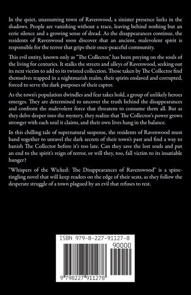 In the quiet, unassuming town of Ravenwood, a sinister presence lurks in the shadows. People are vanishing without a trace, leaving behind nothing but an eerie silence and a growing sense of dread. As the disappearances continue, the residents of Ravenwood soon discover that an ancient, malevolent spirit is responsible for the terror that grips their once-peaceful community. This evil entity, known only as "The Collector," has been preying on the souls of the living for centuries. It stalks the streets and alleys of Ravenwood, seeking out its next victim to add to its twisted collection. Those taken by The Collector find themselves trapped in a nightmarish realm, their spirits enslaved and corrupted, forced to serve the dark purposes of their captor. As the town's population dwindles and fear takes hold, a group of unlikely heroes emerges. They are determined to uncover the truth behind the disappearances and confront the malevolent force that threatens to consume them all. But as they delve deeper into the mystery, they realize that The Collector's power grows stronger with each soul it claims, and their own lives hang in the balance. In this chilling tale of supernatural suspense, the residents of Ravenwood must band together to unravel the dark secrets of their town's past and find a way to banish The Collector before it's too late. Can they save the lost souls and put an end to the spirit's reign of terror, or will they, too, fall victim to its insatiable hunger? "Whispers of the Wicked: The Disappearances of Ravenswood" is a spine-tingling novel that will keep readers on the edge of their seats, as they follow the desperate struggle of a town plagued by an evil that refuses to rest.