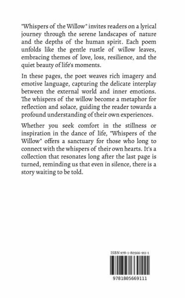 "Whispers of the Willow" invites readers on a lyrical journey through the serene landscapes of nature and the depths of the human spirit. Each poem unfolds like the gentle rustle of willow leaves, embracing themes of love, loss, resilience, and the quiet beauty of life's moments. In these pages, the poet weaves rich imagery and emotive language, capturing the delicate interplay between the external world and inner emotions. The whispers of the willow become a metaphor for reflection and solace, guiding the reader towards a profound understanding of their own experiences. Whether you seek comfort in the stillness or inspiration in the dance of life, "Whispers of the Willow" offers a sanctuary for those who long to connect with the whispers of their own hearts. It's a collection that resonates long after the last page is turned, reminding us that even in silence, there is a story waiting to be told.