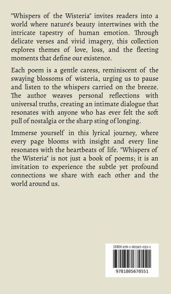 "Whispers of the Wisteria" invites readers into a world where nature's beauty intertwines with the intricate tapestry of human emotion. Through delicate verses and vivid imagery, this collection explores themes of love, loss, and the fleeting moments that define our existence. Each poem is a gentle caress, reminiscent of the swaying blossoms of wisteria, urging us to pause and listen to the whispers carried on the breeze. The author weaves personal reflections with universal truths, creating an intimate dialogue that resonates with anyone who has ever felt the soft pull of nostalgia or the sharp sting of longing. Immerse yourself in this lyrical journey, where every page blooms with insight and every line resonates with the heartbeats of life. "Whispers of the Wisteria" is not just a book of poems; it is an invitation to experience the subtle yet profound connections we share with each other and the world around us.