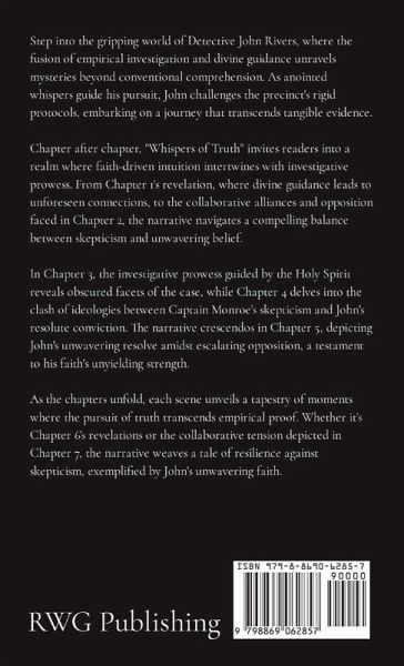 Step into the gripping world of Detective John Rivers, where the fusion of empirical investigation and divine guidance unravels mysteries beyond conventional comprehension. As anointed whispers guide his pursuit, John challenges the precinct's rigid protocols, embarking on a journey that transcends tangible evidence. Chapter after chapter, "Whispers of Truth" invites readers into a realm where faith-driven intuition intertwines with investigative prowess. From Chapter 1's revelation, where divine guidance leads to unforeseen connections, to the collaborative alliances and opposition faced in Chapter 2, the narrative navigates a compelling balance between skepticism and unwavering belief. In Chapter 3, the investigative prowess guided by the Holy Spirit reveals obscured facets of the case, while Chapter 4 delves into the clash of ideologies between Captain Monroe's skepticism and John's resolute conviction. The narrative crescendos in Chapter 5, depicting John's unwavering resolve amidst escalating opposition, a testament to his faith's unyielding strength. As the chapters unfold, each scene unveils a tapestry of moments where the pursuit of truth transcends empirical proof. Whether it's Chapter 6's revelations or the collaborative tension depicted in Chapter 7, the narrative weaves a tale of resilience against skepticism, exemplified by John's unwavering faith. The narrative culminates in Chapter 8, where confrontations intensify, and John's steadfast belief in divine guidance shines brighter amidst adversities. From Chapter 9's revelations to the unraveling conflicts of Chapter 10, the story unfolds, demonstrating the extraordinary synergy between empirical evidence and spiritual intuition. In the labyrinth of Chapter 11, pivotal breakthroughs and confrontations come to light, portraying the relentless pursuit of truth amid opposition. The chapters resonate with the struggle encapsulated in Chapter 12, showcasing the unwavering resolve forged by the fusion of empirical evidence and ethereal insights, culminating in a captivating narrative of faith, perseverance, and the pursuit of absolute truth.