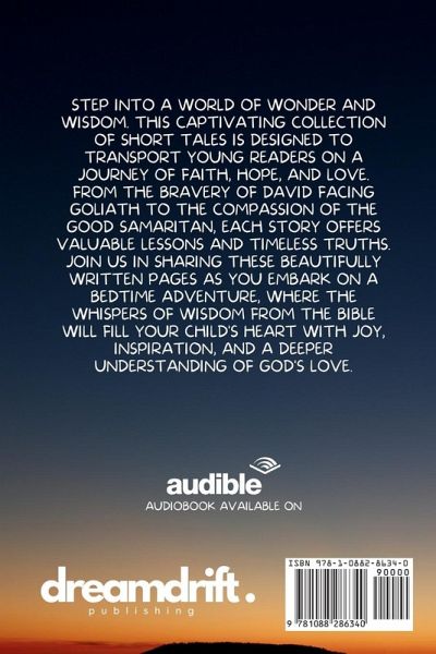Are you seeking a serene bedtime tradition that's both meaningful and spiritually enriching for your family? Introducing "Whispers Of Wisdom: Bible Stories for Kids at Bedtime," a delightful gateway to forging cherished family moments and nurturing your children's faith. This book offers a unique blend of Bible stories for kids, making it a wonderful choice for a children's Christian devotional book. Within the tranquil twilight hours, when the world hushes and stillness prevails, these timeless tales from the Bible come alive, providing a perfect opportunity to bond with your children while fostering their spiritual growth. "Whispers Of Wisdom" is more than just a children's Christian book; it's a treasury of biblical children's stories designed to transcend time and place, delivering universal truths for kids of all ages. These stories convey essential values like courage, kindness, faith, and forgiveness, all wrapped in the boundless love of God. From the bravery of young David confronting the giant Goliath to the wisdom of King Solomon, from the loyalty of Ruth to the courage of Queen Esther, each tale within this collection serves as a conduit for moral and spiritual lessons, making it an ideal kids' Bible story book. This carefully curated collection offers an immersive experience, making it an excellent choice for kids' faith books. Children will embark on an enriching journey through biblical adventures, from Noah's epic voyage to Daniel's miraculous bond with lions. They'll learn from parables like the Prodigal Son and the awe-inspiring story of the Lost Coin. Each story is thoughtfully designed to encourage reflection and contemplation, ensuring your children gain a deeper understanding of the profound biblical messages, making it an excellent Bible devotional for kids. Through the magic of words, "Whispers Of Wisdom" encourages kids to create vivid mental images, igniting their imagination as they delve into the grandeur of Noah's Ark or the courage in Daniel's eyes. This fosters a more personal and profound connection to these timeless stories. This isn't just a collection of Bible stories for kids; it's a treasure chest of life lessons. "Whispers Of Wisdom" subtly weaves children's Christian books, biblical children's stories, and kids' faith books into one heartwarming bedtime experience. As you read these stories together, whispering words of wisdom into the night, you're passing down the enduring legacy of faith, hope, love, and kindness, enriching your children's spiritual journey. We invite you to make "Whispers Of Wisdom" a cherished part of your nightly routine, forging a closer connection to the timeless wisdom of the Bible, and nurturing meaningful conversations with your children. So, step into the world of "Whispers Of Wisdom: Bible Stories for Kids at Bedtime." The stories are ready to unfold, speaking to young hearts as they nestle under the covers, allowing the whispers of wisdom to fill their bedtime routine. These beautifully crafted narratives are designed to captivate young minds, ensuring that even the youngest readers can follow along and grasp the powerful messages hidden within each tale. "Whispers Of Wisdom: Bible Stories for Kids at Bedtime" is the perfect choice for parents seeking Bible books for kids that also serve as a Christian devotional.