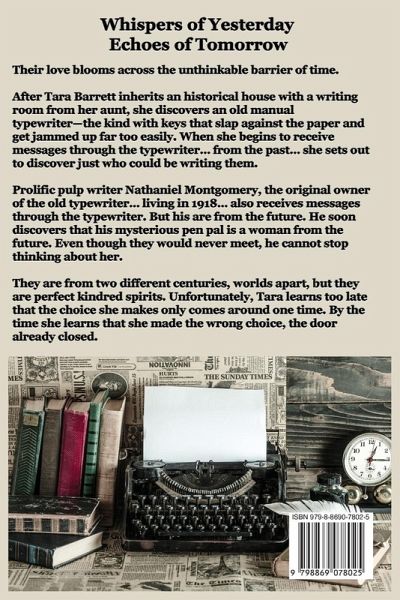 Their love blooms across the unthinkable barrier of time. After Tara Barrett inherits an historical house with a writing room from her aunt, she discovers an old manual typewriter-the kind with keys that slap against the paper and get jammed up far too easily. When she begins to receive messages through the typewriter... from the past... she sets out to discover just who could be writing them. Prolific pulp writer Nathaniel Montgomery, the original owner of the old typewriter... living in 1918... also receives messages through the typewriter. But his are from the future. He soon discovers that his mysterious pen pal is a woman from the future. Even though they would never meet, he cannot stop thinking about her. They are from two different centuries, worlds apart, but they are perfect kindred spirits. Unfortunately, Tara learns too late that the choice she makes only comes around one time. By the time she learns that she made the wrong choice, the door already closed. If you love emotional time travel romance, grab your copy and jump right into the magic.